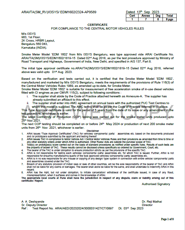 ARAI/TA(SM)/I3SYS/EDM1601/ ARAI/TA(SM_EXT)/I3SYS/EDM1601/ ARAI/TA(SM_EXT)/I3SYS/ ARAI/TA(SM_RV)/I3SYS/EDM1601/ (This certificate is valid only for the smoke meter units already present in the field and supplied on or before 22nd May 2022)